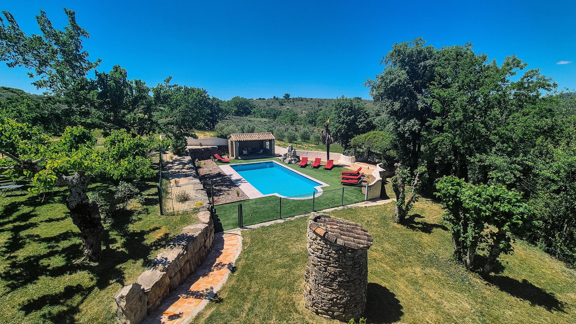 Les visiteurs peuvent profiter d'une vue imprenable sur les montagnes environnantes tout en se prélassant dans le jardin ombragé par des muriers. La piscine privée offre un espace de détente idéal et permet de se rafraîchir pendant les chaudes journées d'été.