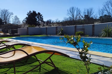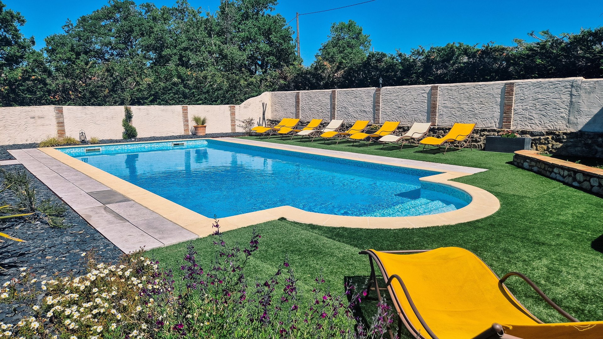 Piscine 10,5 x 5 m sécurisée, son pool house, meubles de jardin en fer forgé, tables en zellige