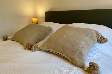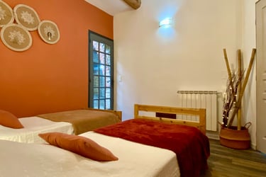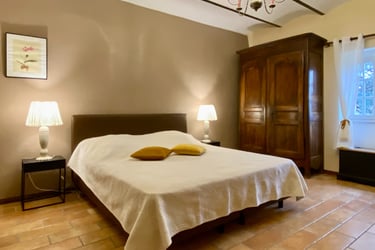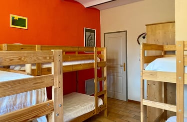 La partie haute du Mas présente une suite parentale avec un lit 160 cm équipée d'une salle de bain personnelle, une chambre avec 8 lits en 90 cm, et une salle d’eau attenante, une suite parentale avec un lit 180 cm avec sa salle d'eau personnelle et WC.