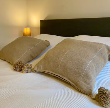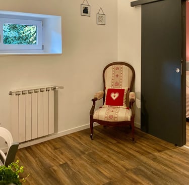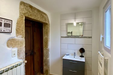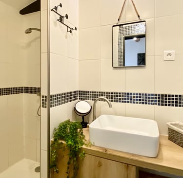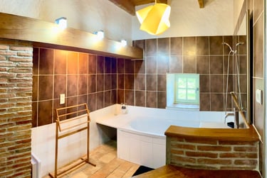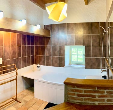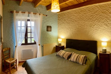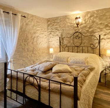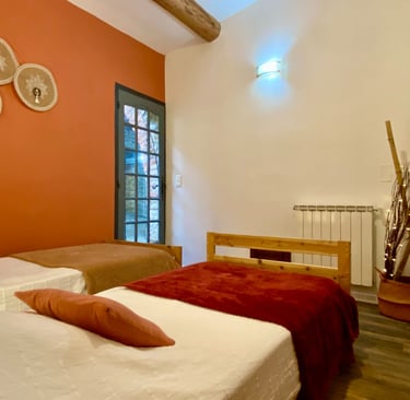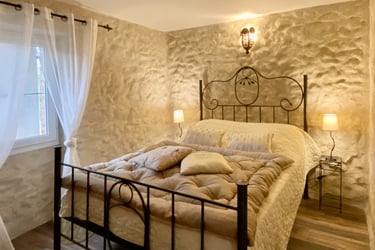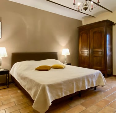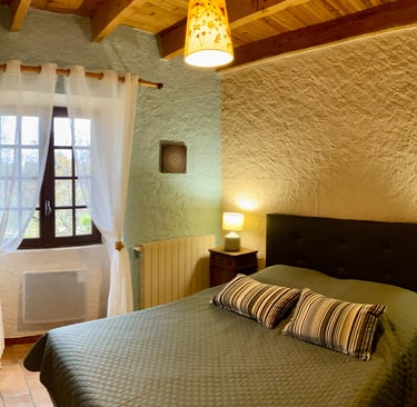 La partie basse du Mas offre une suite familiale avec un lit 160 cm, et une chambre pour enfants attenante avec deux lits 90 cm, 2 salles d'eau et 2 WC, une deuxième suite familiale avec un lit en 160 cm, et une pièce attenante qui peut faire office de chambre enfant (bébé) ou espace bureau lecture avec une salle de bain et WC privés, enfin, une suite parentale équipée d'une salle d'eau personnelle et WC, avec un lit en 160cm.